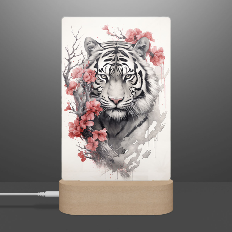 Součástí balení je akrylové sklo dle výběru, dřevěný RGB LED stojánek a napájecí USB kabel.