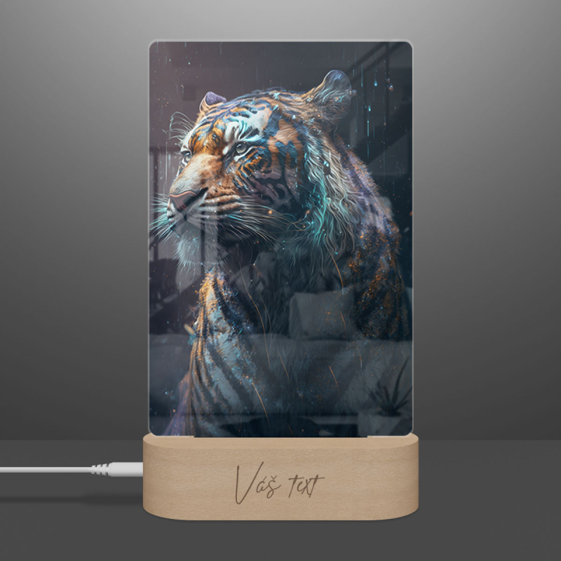 Součástí balení je akrylové sklo dle výběru, dřevěný RGB LED stojánek a napájecí USB kabel.