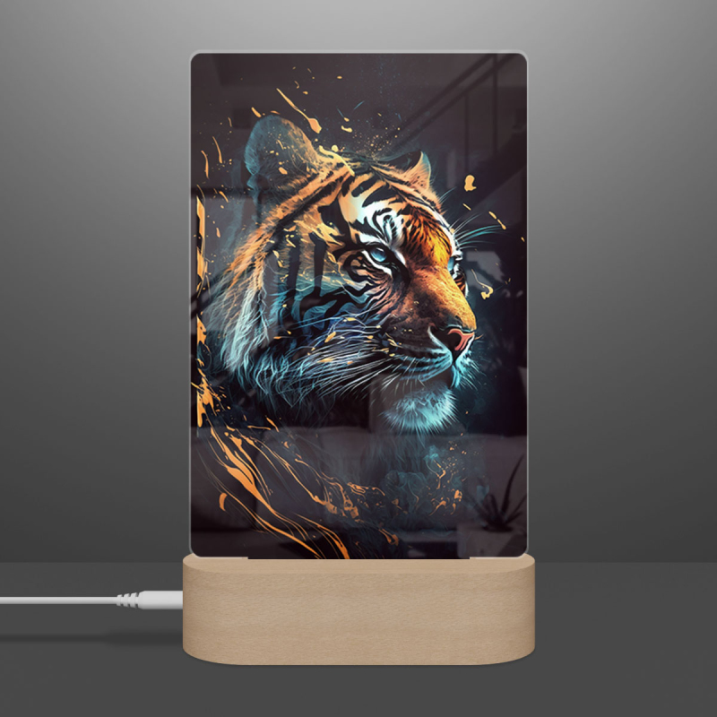 Součástí balení je akrylové sklo dle výběru, dřevěný RGB LED stojánek a napájecí USB kabel.