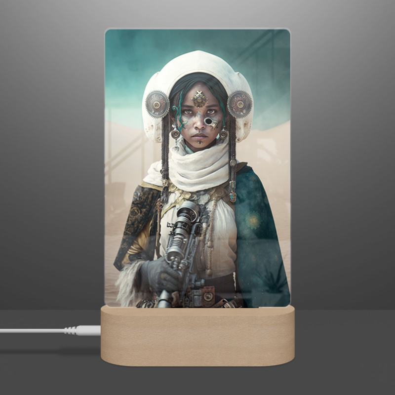 Součástí balení je akrylové sklo dle výběru, dřevěný RGB LED stojánek a napájecí USB kabel.