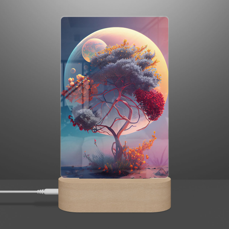 Součástí balení je akrylové sklo dle výběru, dřevěný RGB LED stojánek a napájecí USB kabel.