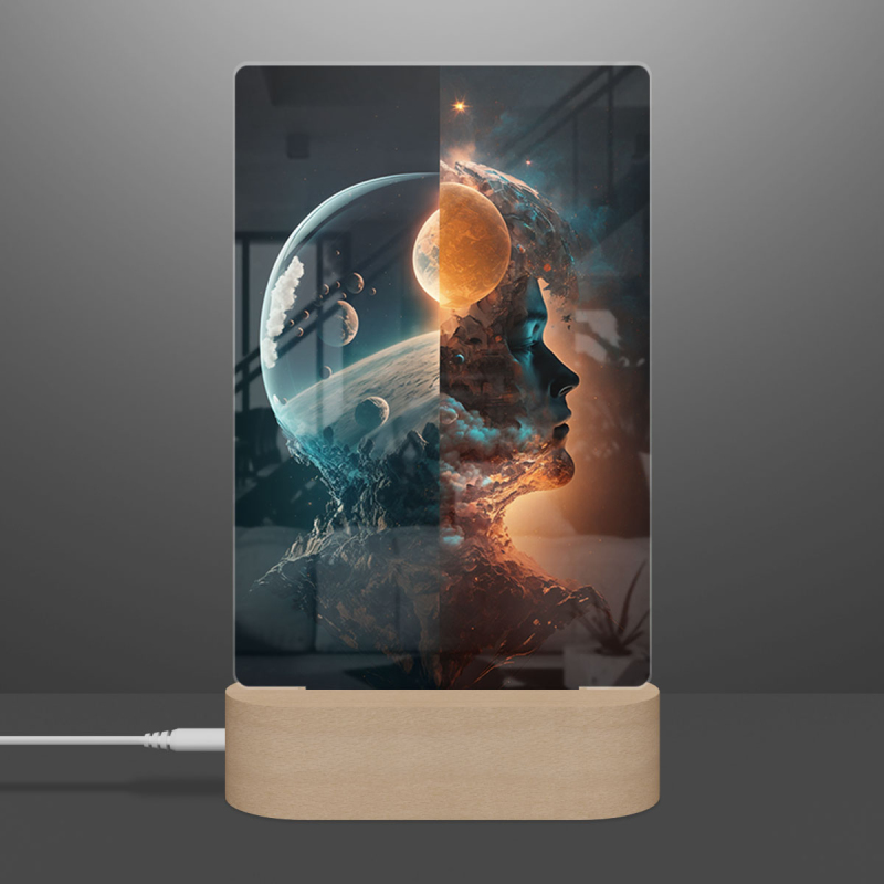 Součástí balení je akrylové sklo dle výběru, dřevěný RGB LED stojánek a napájecí USB kabel.