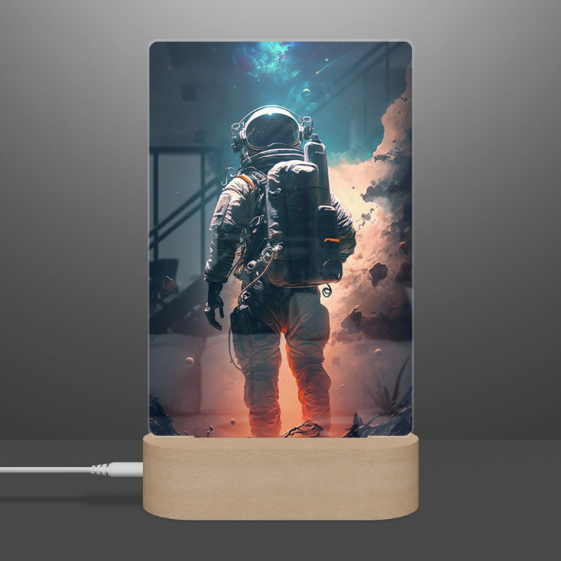 Součástí balení je akrylové sklo dle výběru, dřevěný RGB LED stojánek a napájecí USB kabel.