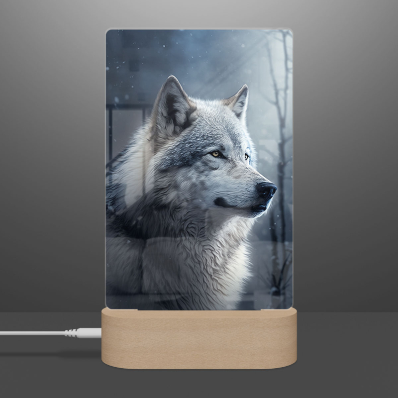 Součástí balení je akrylové sklo dle výběru, dřevěný RGB LED stojánek a napájecí USB kabel.