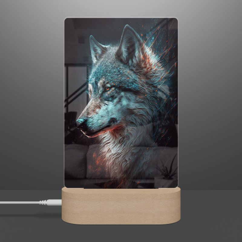 Součástí balení je akrylové sklo dle výběru, dřevěný RGB LED stojánek a napájecí USB kabel.