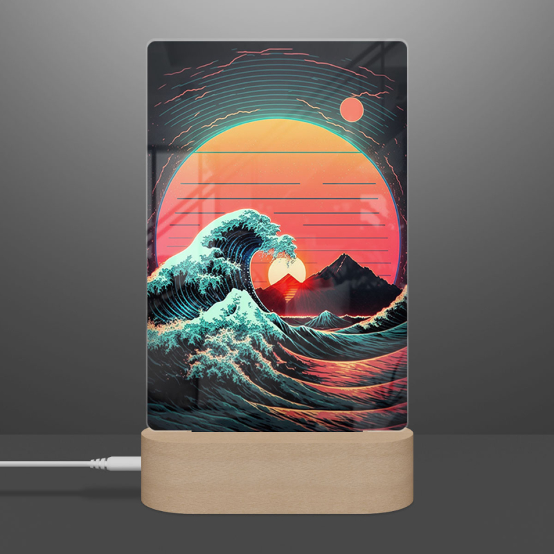 Součástí balení je akrylové sklo dle výběru, dřevěný RGB LED stojánek a napájecí USB kabel.