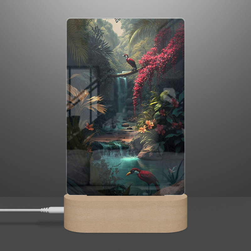Součástí balení je akrylové sklo dle výběru, dřevěný RGB LED stojánek a napájecí USB kabel.