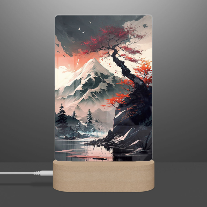 Součástí balení je akrylové sklo dle výběru, dřevěný RGB LED stojánek a napájecí USB kabel.