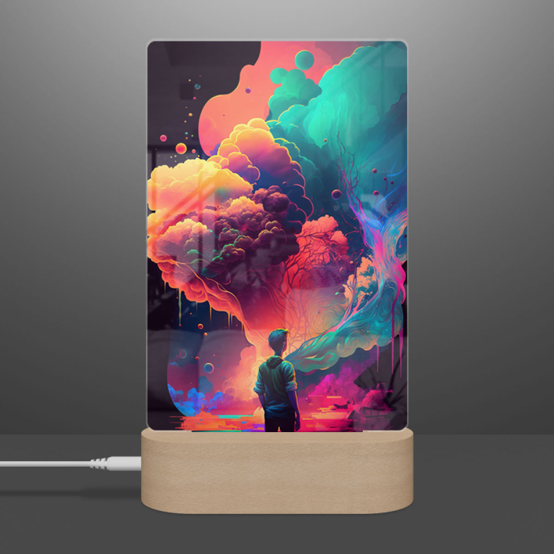 Součástí balení je akrylové sklo dle výběru, dřevěný RGB LED stojánek a napájecí USB kabel.