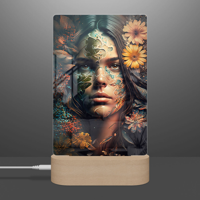 Součástí balení je akrylové sklo dle výběru, dřevěný RGB LED stojánek a napájecí USB kabel.
