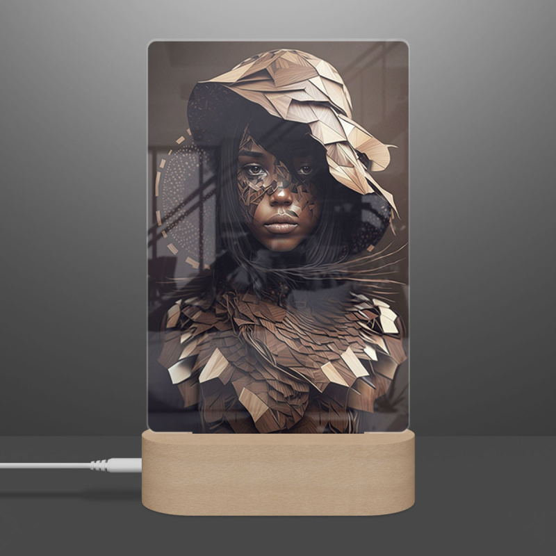 Součástí balení je akrylové sklo dle výběru, dřevěný RGB LED stojánek a napájecí USB kabel.