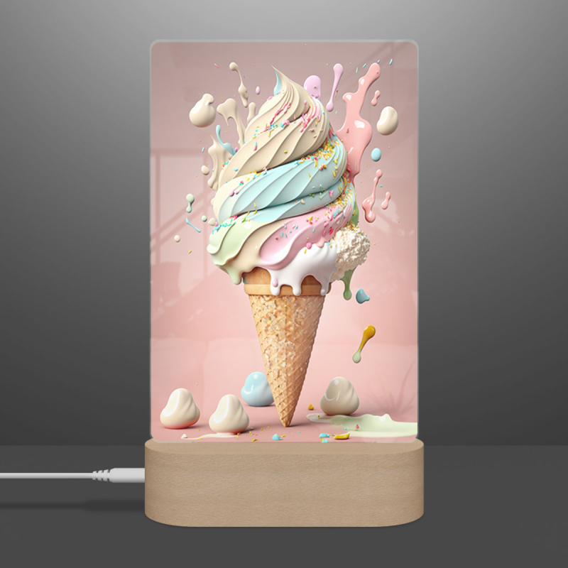 Součástí balení je akrylové sklo dle výběru, dřevěný RGB LED stojánek a napájecí USB kabel.