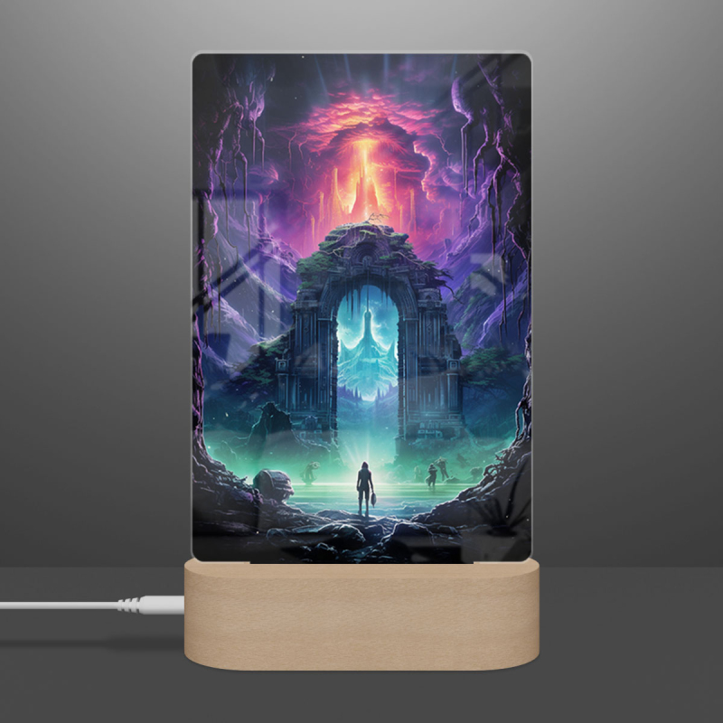 Součástí balení je akrylové sklo dle výběru, dřevěný RGB LED stojánek a napájecí USB kabel.