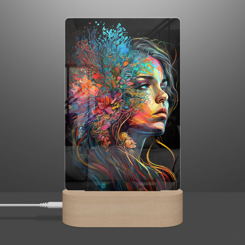 Součástí balení je akrylové sklo dle výběru, dřevěný RGB LED stojánek a napájecí USB kabel.