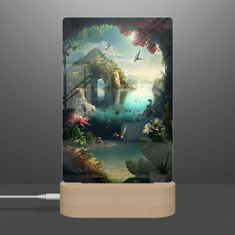 Součástí balení je akrylové sklo dle výběru, dřevěný RGB LED stojánek a napájecí USB kabel.