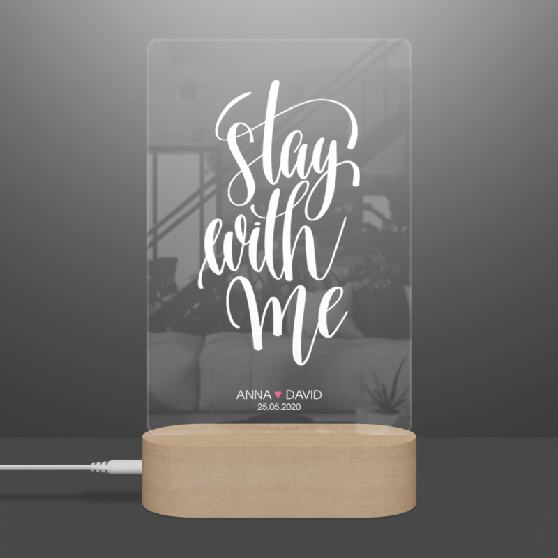 Součástí balení je akrylové sklo dle výběru, dřevěný RGB LED stojánek a napájecí USB kabel.