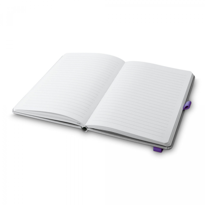Poznámkový linkovaný zápisník s gumičkou, kovovým butonkem, vlepenou kapsou a poutkem na psací potřeby, 192 stran. 140 x 205 mm