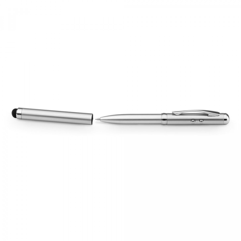 Multifunkční kovové kuličkové pero s klipem. Kuličkové pero s mini LED svítilnou, laserovým ukazovátkem a dotykovou špičkou. Dodáváno v kovovém pouzdře. Obsahuje 3 baterie LR41. Modrý inkoust. ø10 x 125 mm | Krabička: 178 x 38 x 19 mm