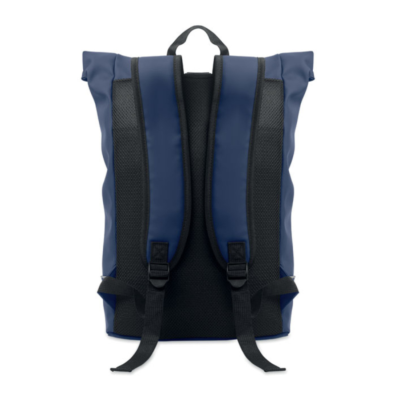 Rolovací batoh na 15palcový notebook z měkkého PU s polstrovanými zády a zesílenou základnou s reflexním pruhem. Vodotěsná přední kapsa na zip. Podšívka z polyesteru 210D RPET.