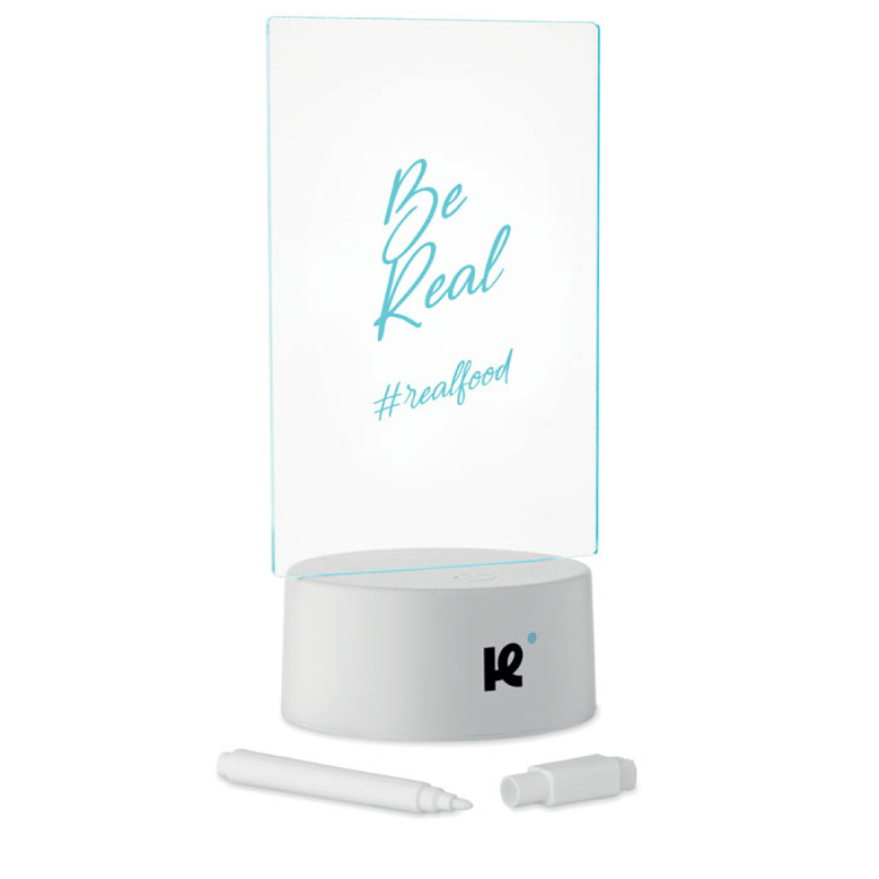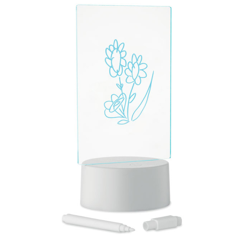 Svítící malá nástěnka LED s měnící se barvou a stíratelným bílým fixem. Akrylová destička a hliníková základna. Napájená bateriemi, vyžaduje 3 x AAA baterie (nejsou součástí balení).