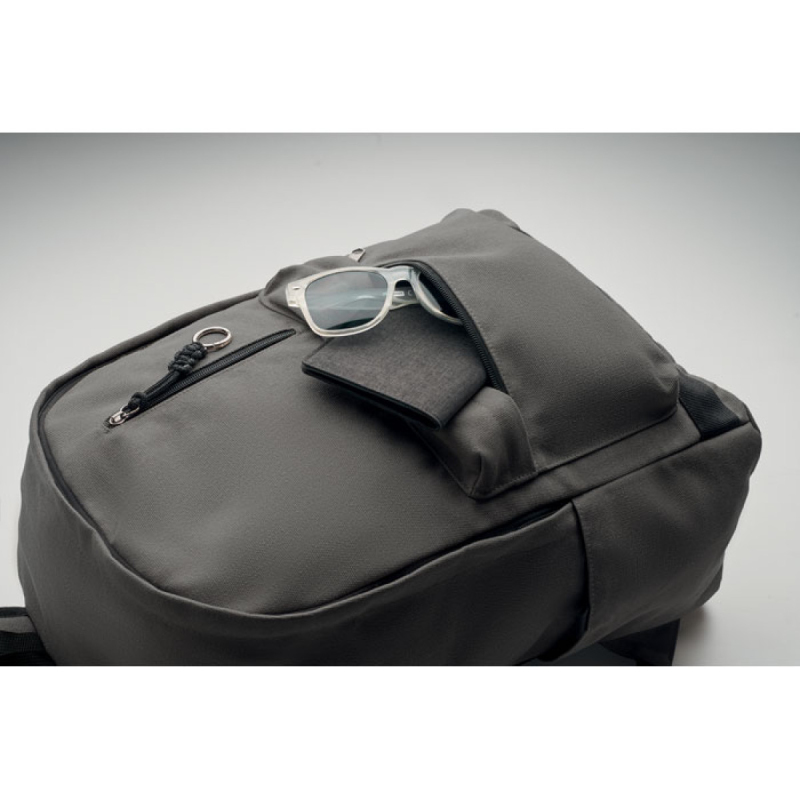 Batoh na 15palcový notebook z recyklované předspotřební bavlny. Velká přední kapsa na zip s vnitřní přihrádkou na notebook. Malá přední kapsa na zip. Dvě boční kapsy. Polstrovaná záda a ramenní popruhy, zadní panel a spodní část. 450 gr/m².