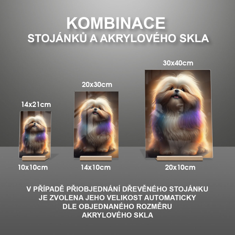 Na produktovém fotu vyobrazena nejoblíbenější varianta akrylového skla 14x21cm a dřevěný stojánek 10x10cm.