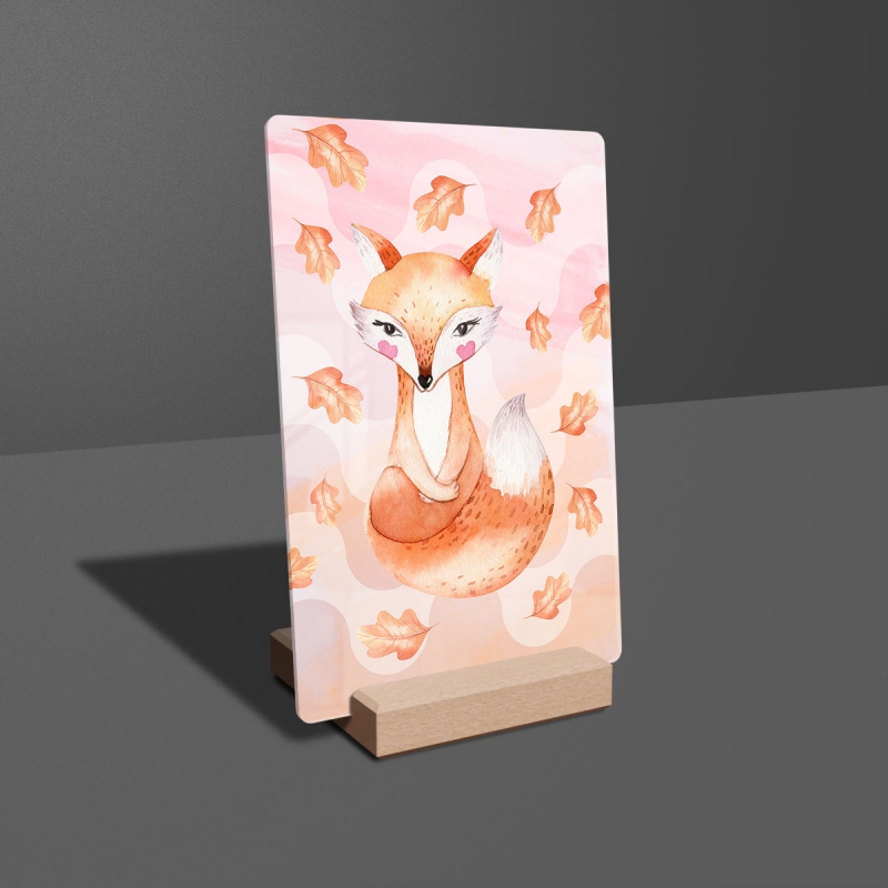 Na produktovém fotu vyobrazena nejoblíbenější varianta akrylového skla 14x21/21x14cm a dřevěný stojánek 10x10cm.