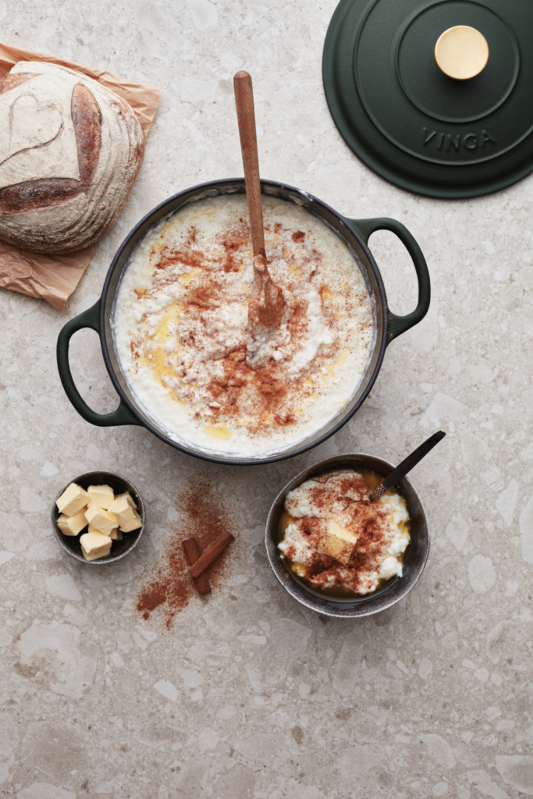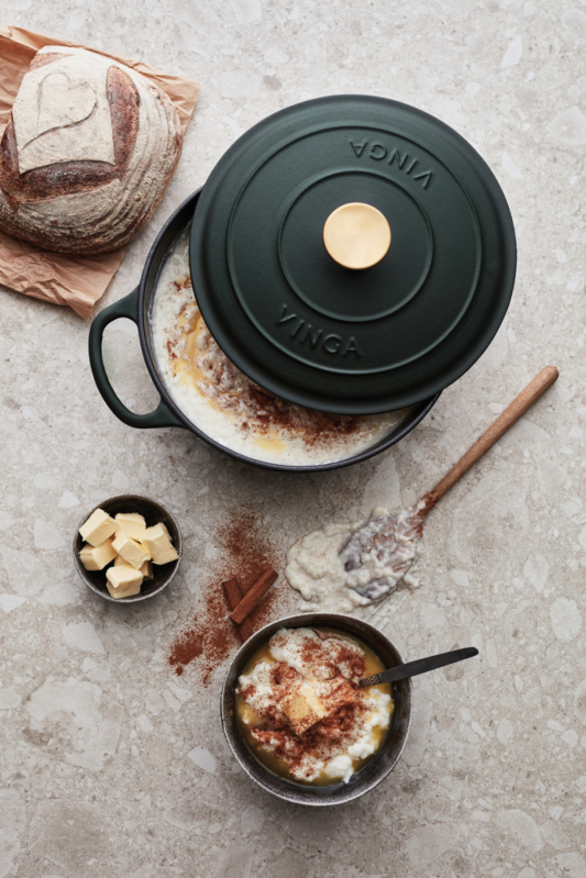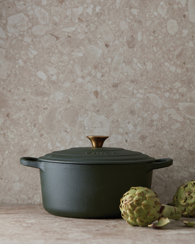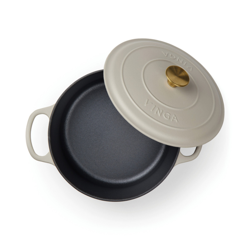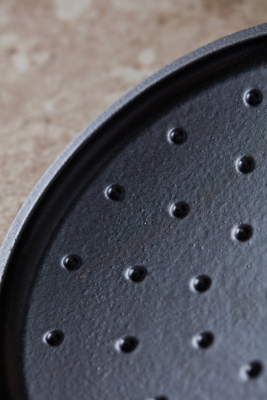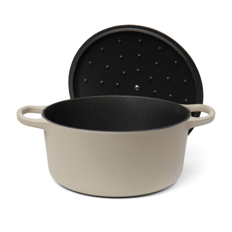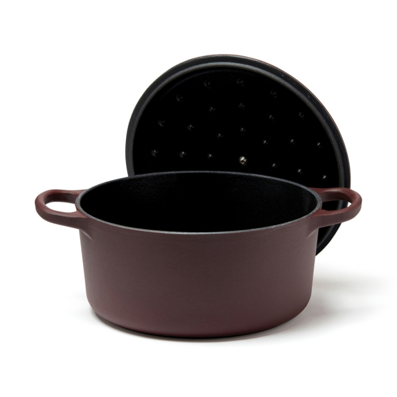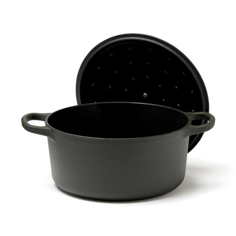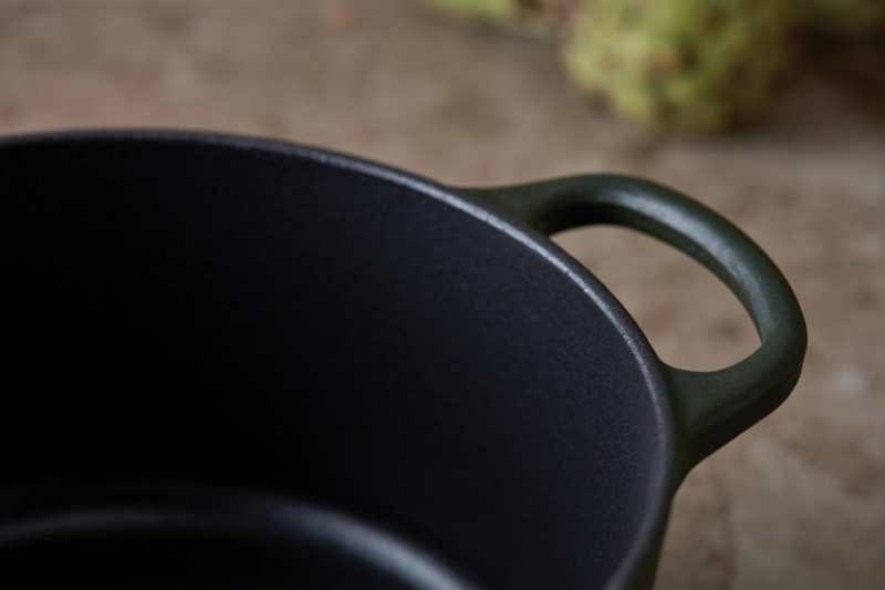 Robustní litinový hrnec ideální pro pomalé vaření díky své výjimečně dlouhé a stabilní tepelné kapacitě. Poklice s malými výstupy na vnitřní straně, které pomáhají rovnoměrně distribuovat kondenzovanou páru. Vnitřní část hrnce je opatřena černým smaltem, který se vyznačuje mírně hrubším povrchem s většími póry. Ty se však časem naplní olejem a vytvoří tak nepřilnavou patinu podobnou surové litině. Vhodný pro všechny typy sporáků, včetně indukčních.