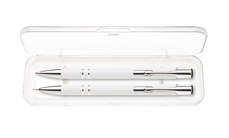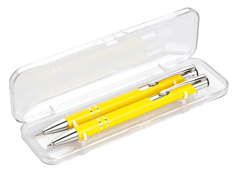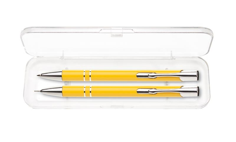 Sada LOBIA žlutá - tužky jsou vyrobeny z hliníku, mají na těle 2 stříbrné proužky a stříbrné doplňky jako jsou špička, klip a cvakátko. Vše dodáváno v plastovém, transparentním boxu.