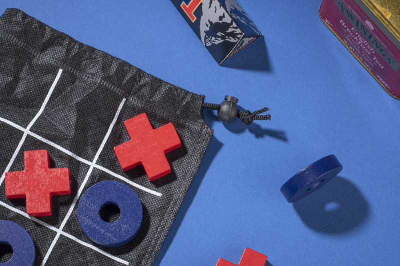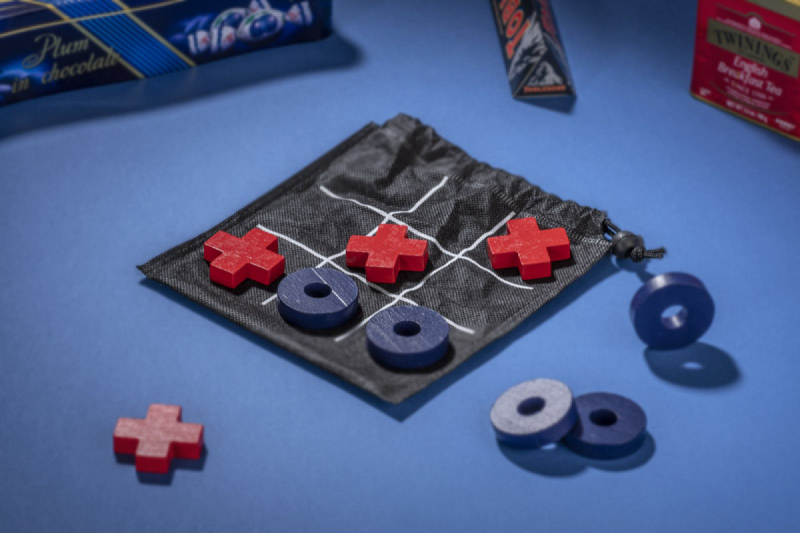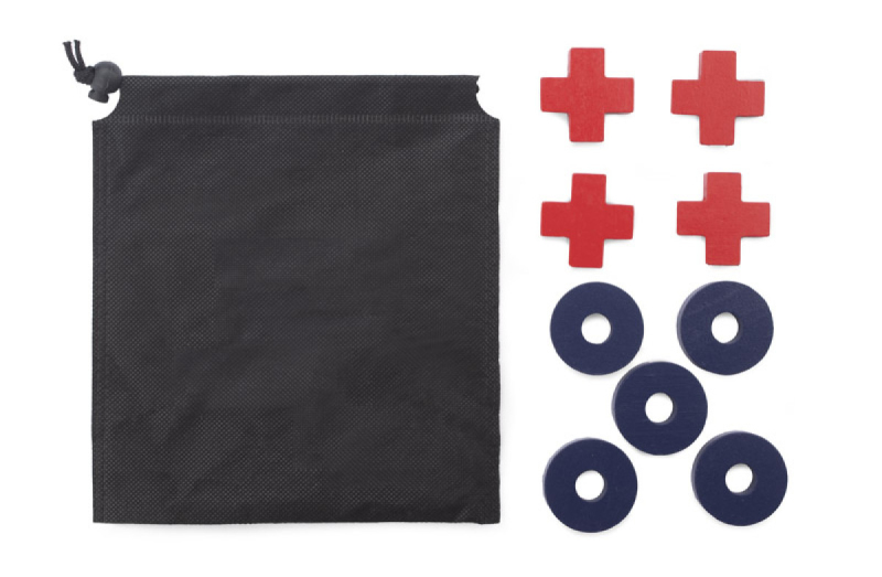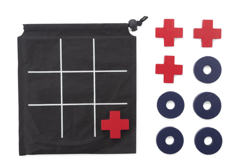 Tic-tac-toe je dobře známá hra, kterou hrají dva hráči. Je balena v černém sáčku s potištěnou deskou. Malý výrobek, ideální na cesty.