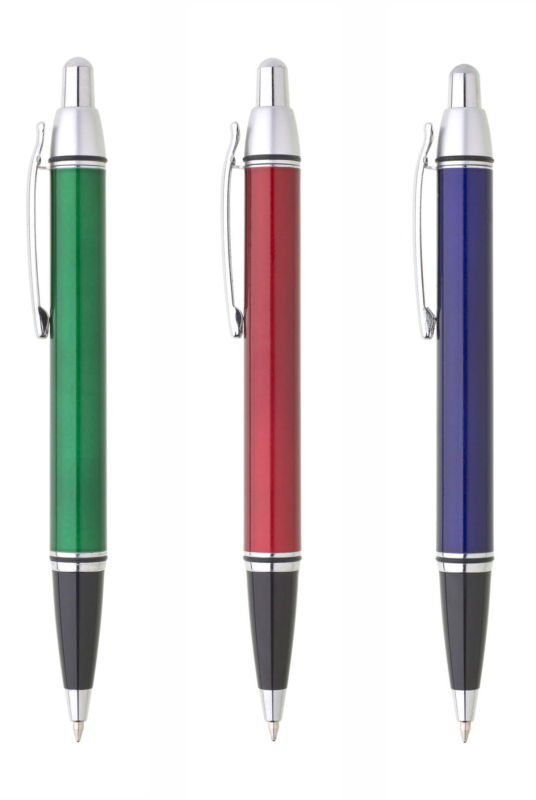 Zelená metalická propiska je doplněna černou špičkou a stříbrnými doplňky. Náplň velkoobsahová, modře píšící.