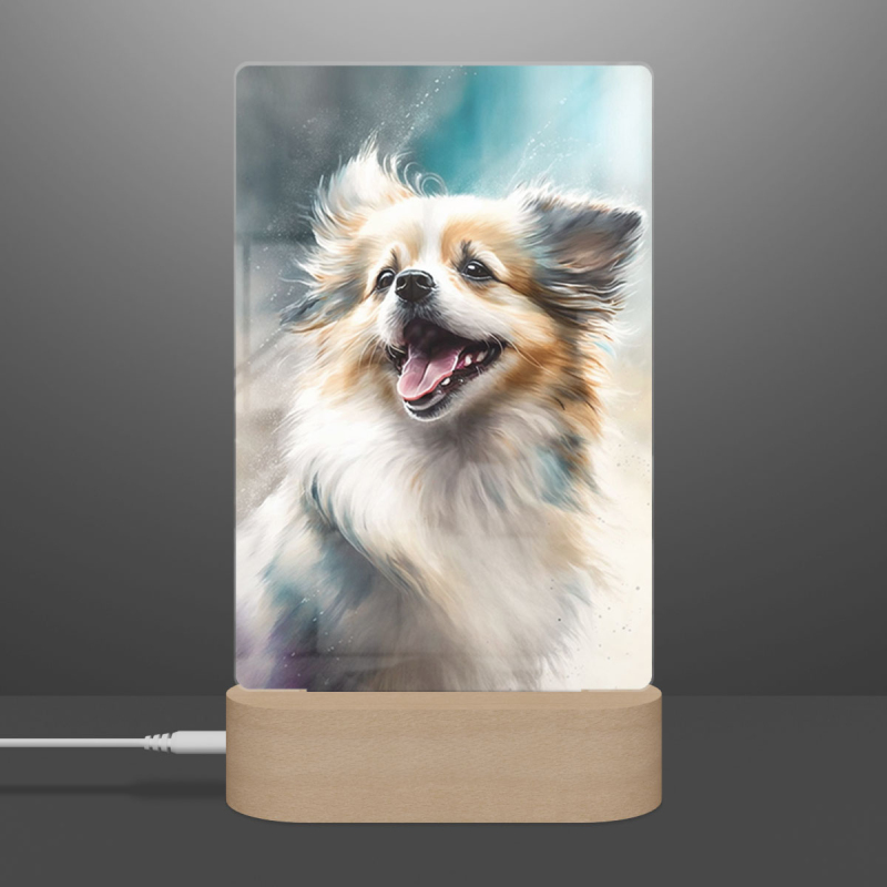 Součástí balení je akrylové sklo dle výběru, dřevěný RGB LED stojánek a napájecí USB kabel.