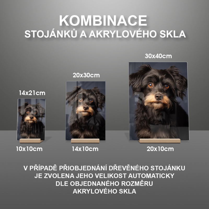 V případě přiobjednání dřevěného stojánku je zvolena jeho velikost automaticky dle objednaného rozměru akrylového skla viz produktové foto.