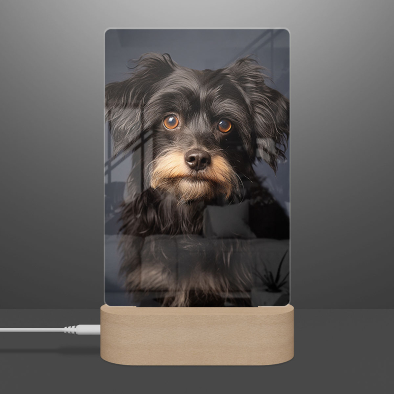 Součástí balení je akrylové sklo dle výběru, dřevěný RGB LED stojánek a napájecí USB kabel.