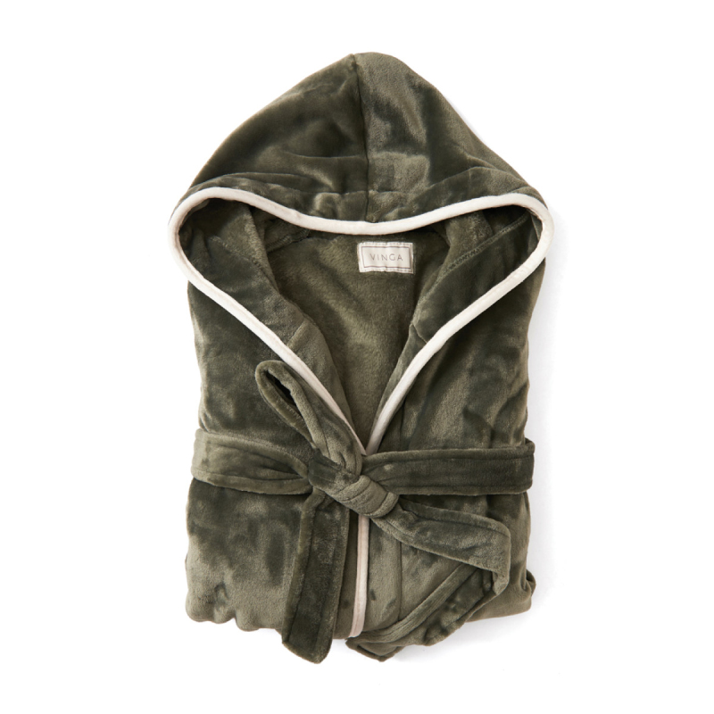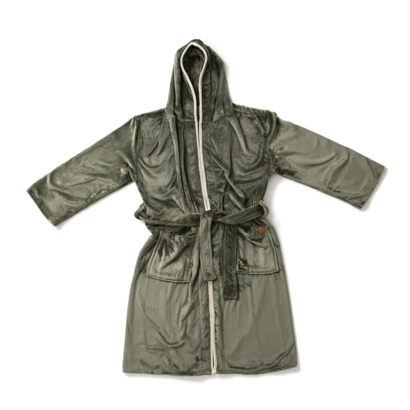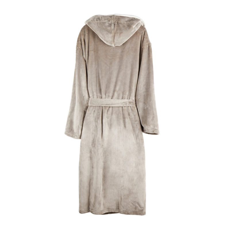 Mimořádně měkký luxusní župan s velkou kapucí a ozdobným lemováním. Dvě přední kapsy a šňůra v pase. Vyrobený z GRS recyklovaného PET. GRS (Global Recycle Standard) je globální standard, který umožňuje ověřit použití recyklovaného materiálu v produktu napříč celým dodavatelským řetězcem. Celkový podíl recyklátu dle váhy produktu: 68 %. Pro snížení objemu a uhlíkové stopy při dopravě je župan balen vakuově. OEKO-TEX Standard 100 značí, že materiál županu splňuje řadu kritérií bezpečnosti výrobku. Velikost L/XL.