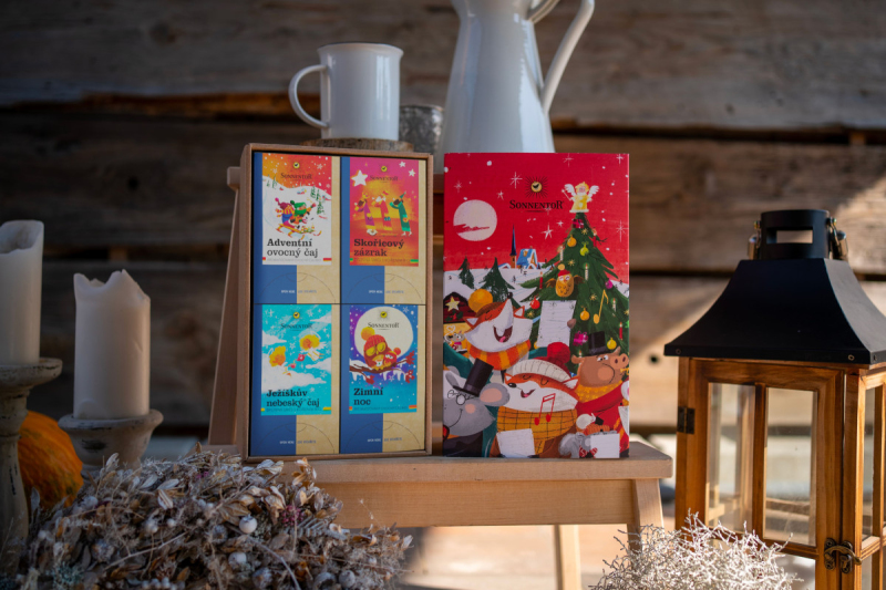 Dárková kazeta obsahuje: Adventní ovocný čaj bio (aromatizovaný ovocný čaj), Ježíškův nebeský čaj bio (bylinný čaj s kořením), Zimní noc bio (aromatizovaný ovocný čaj), Skořicový zázrak bio (bylinná směs s kořením)