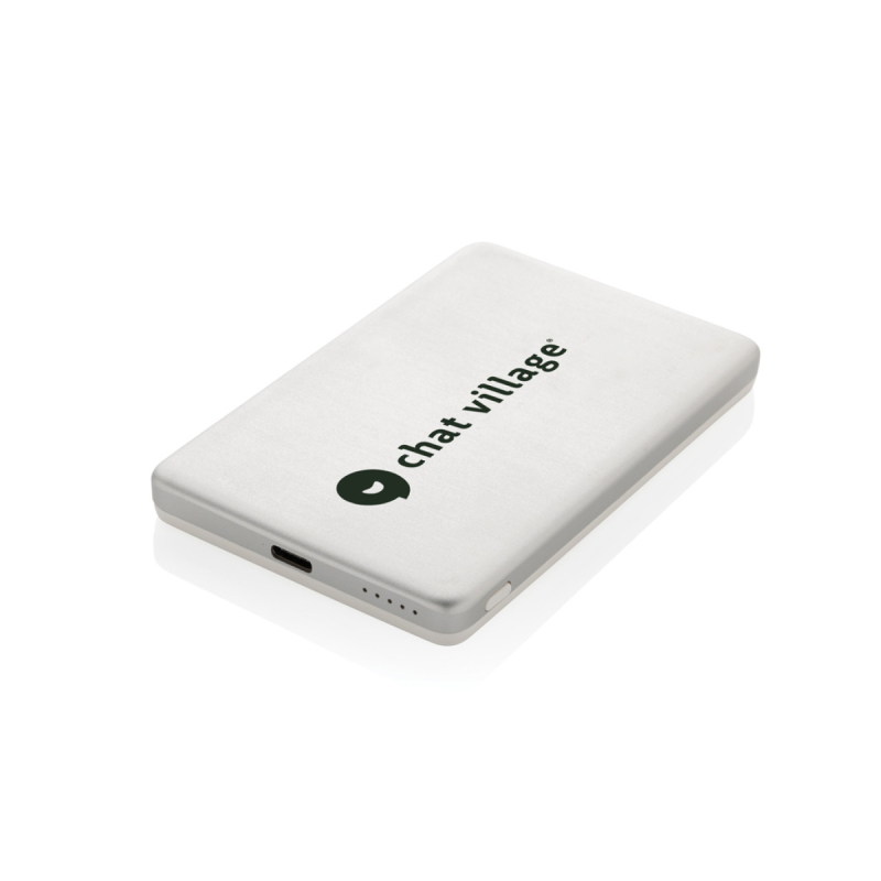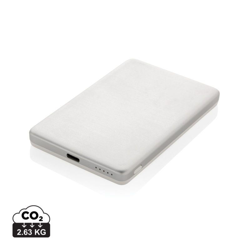 Ultratenká powerbanka s kapacitou 5 000 mAh a 5W magnetickou bezdrátovou nabíječkou, jejíž pouzdro je vyrobeno z recyklovaného hliníku s certifikací RCS a recyklovaného plastu ABS. RCS je standard pro ověření recyklovaného obsahu výrobku v celém dodavatelském řetězci. Celkový recyklovaný obsah: 23 % na základě celkové hmotnosti výrobku. Powerbanka obsahuje lithium-polymerovou baterii třídy A s dlouhou výdrží 5 000 mAh. Vstup typu C 5V/2,4A; výstup USB C: 5V/2A.4A. Položka a příslušenství neobsahují PVC. Včetně recyklovaného nabíjecího kabelu TPE s certifikací RCS. Baleno ve směsném obalu FSC®.