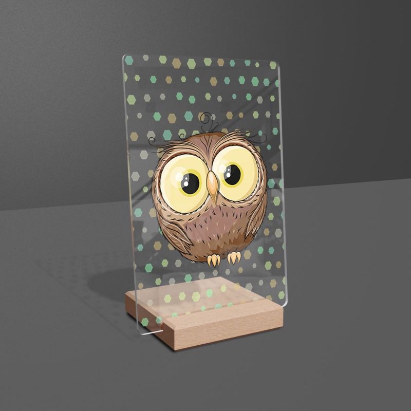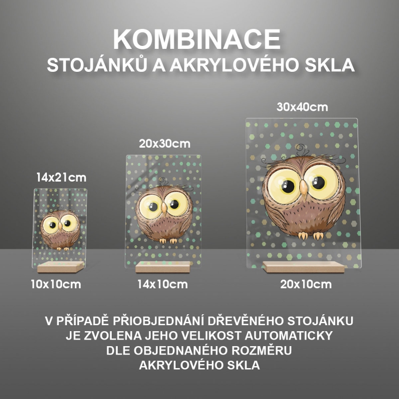 Na produktovém fotu vyobrazena nejoblíbenější varianta akrylového skla 14x21/21x14cm a dřevěný stojánek 10x10cm.