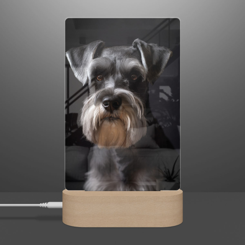 Součástí balení je akrylové sklo dle výběru, dřevěný RGB LED stojánek a napájecí USB kabel.