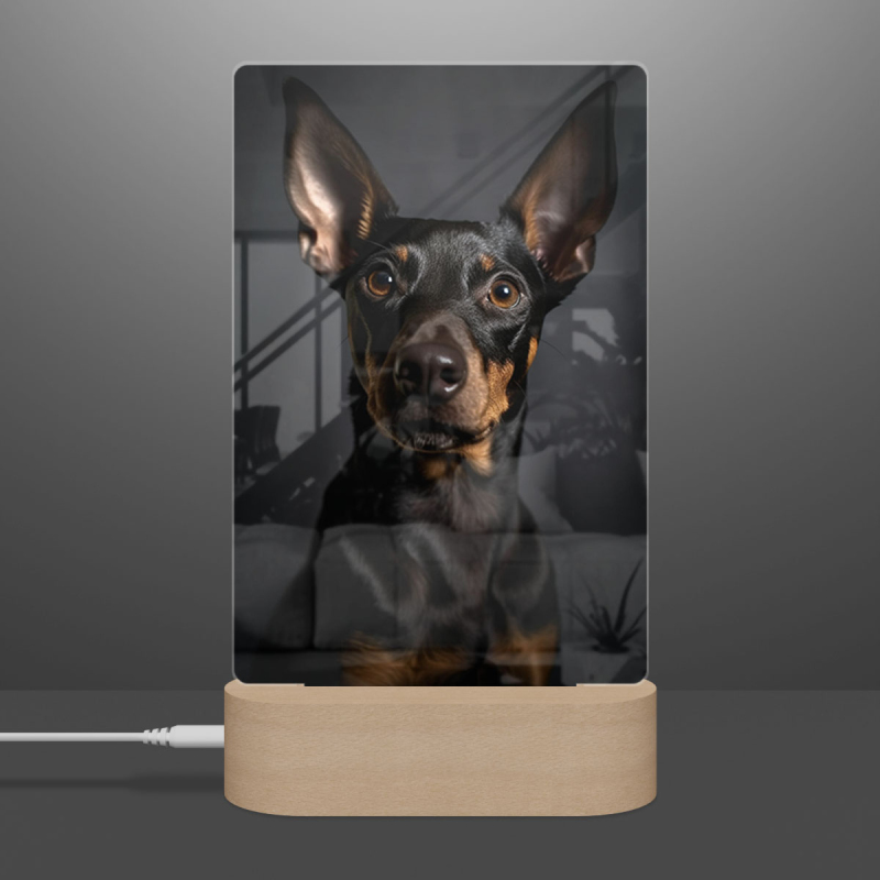 Součástí balení je akrylové sklo dle výběru, dřevěný RGB LED stojánek a napájecí USB kabel.