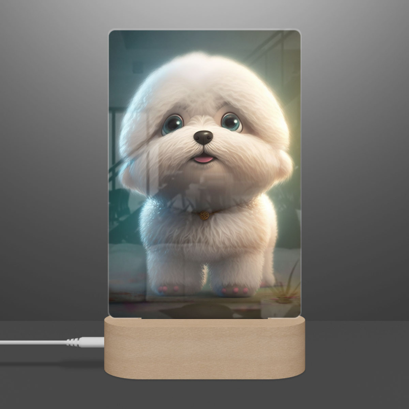 Součástí balení je akrylové sklo dle výběru, dřevěný RGB LED stojánek a napájecí USB kabel.