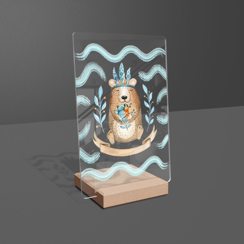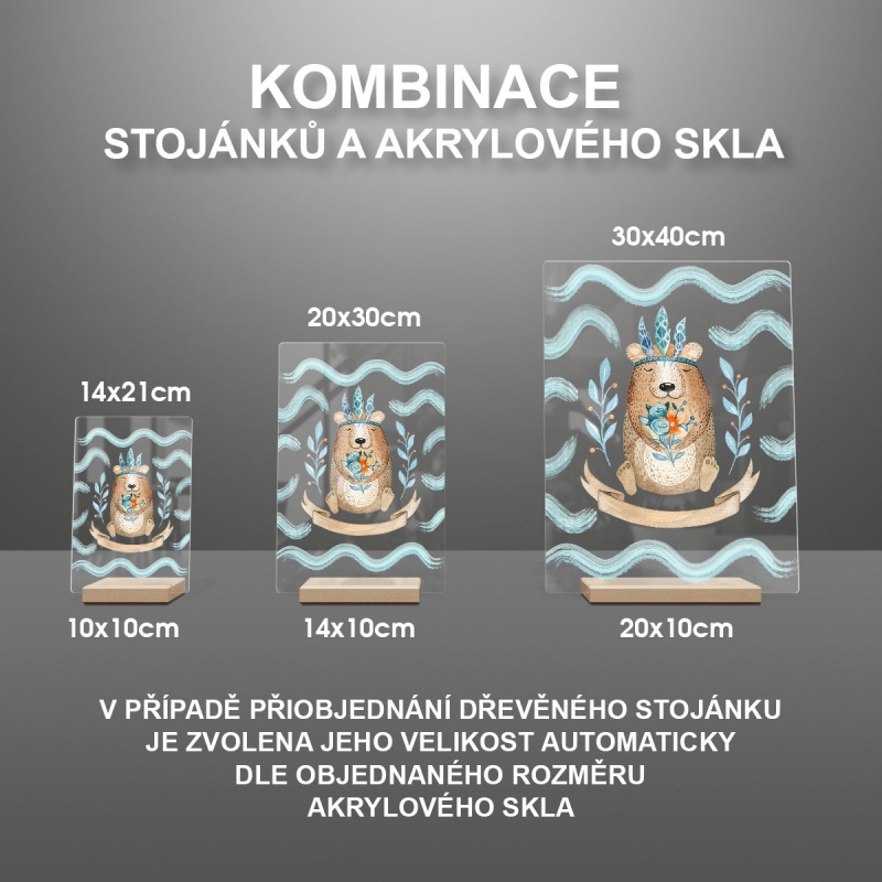 Na produktovém fotu vyobrazena nejoblíbenější varianta akrylového skla 14x21/21x14cm a dřevěný stojánek 10x10cm.