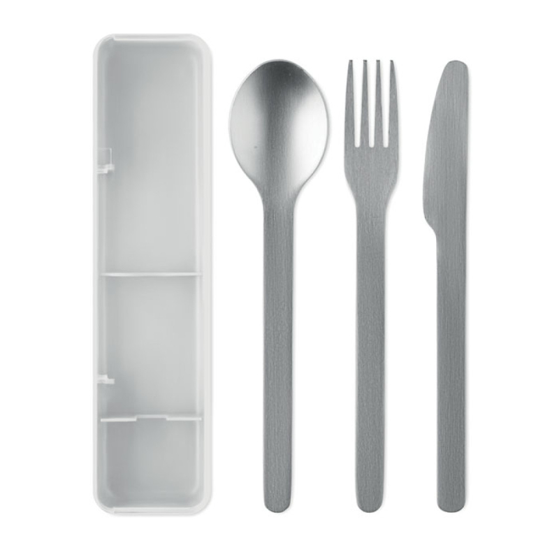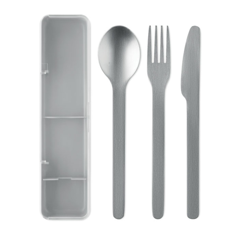 Sada příborů z nerezové oceli v pouzdru z PP. Obsahuje vidličku, nůž a lžíci.
