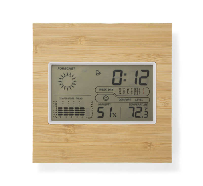 JUPITER je meteorologická stanice s možností měření teploty uvnitř místnosti. Má následující funkce: čas, datum, den v týdnu, vnitřní teplotu, vlhkost vzduchu, úroveň pohodlí, vizualizaci počasí a budík. Přední část pouzdra je pokryta bambusovou vrstvou, která dokonale ladí s minimalistickým designem interiéru.