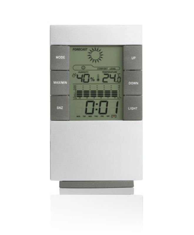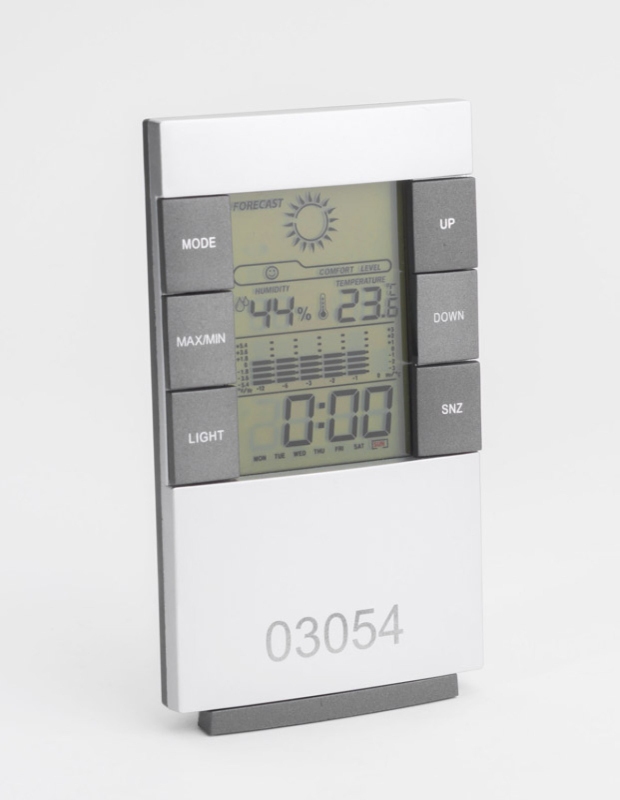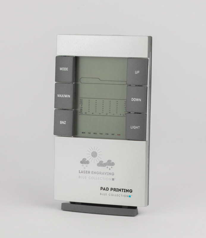 Díky této moderní meteorologické stanici nebude více problém s předpovědí počasí. Tato meteorologická stanice je teploměr, hygrometr, budík, kalendář, biometr a meteorologická stanice. Má také podsvícenou obrazovku. Logo může být vyraženo nebo vyryto na přední straně produktu.