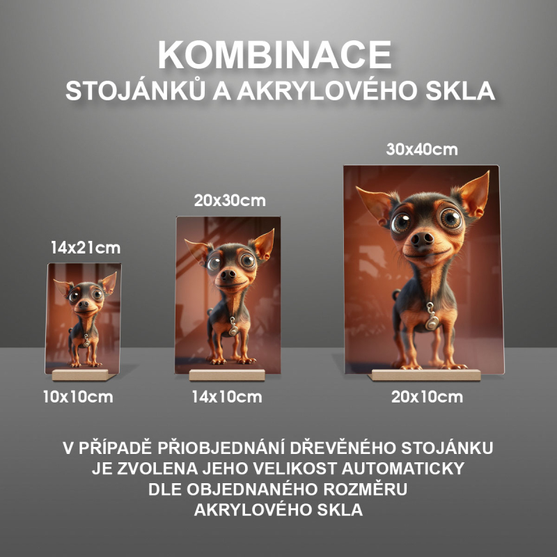 Na produktovém fotu vyobrazena nejoblíbenější varianta akrylového skla 14x21cm a dřevěný stojánek 10x10cm.