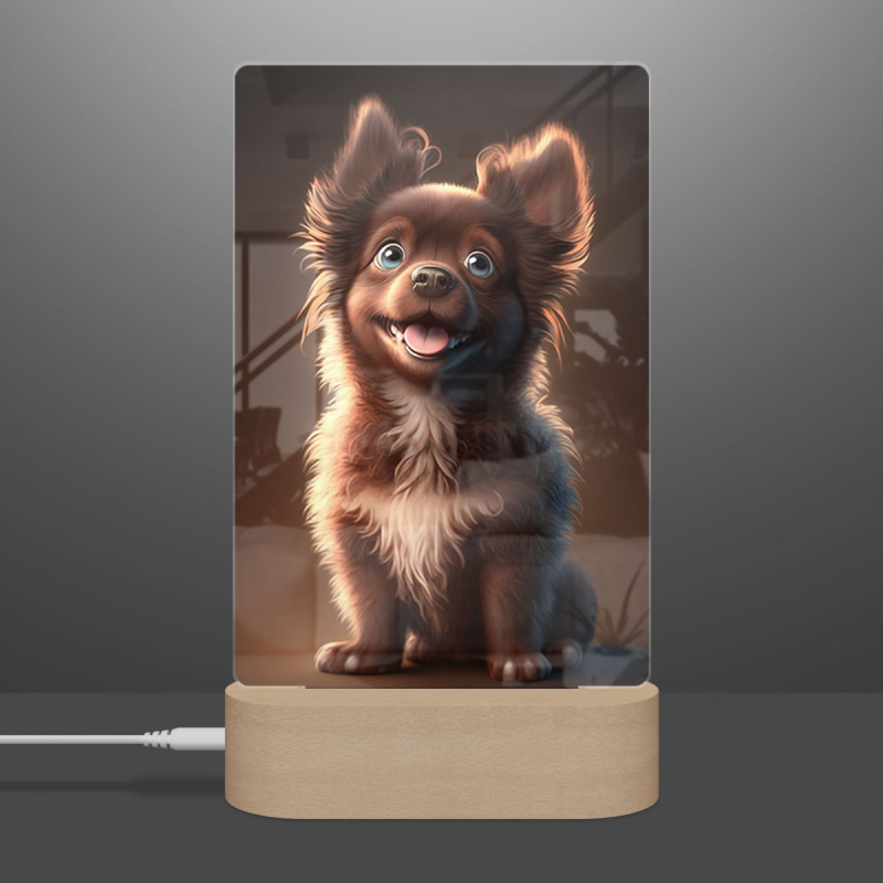 Součástí balení je akrylové sklo dle výběru, dřevěný RGB LED stojánek a napájecí USB kabel.