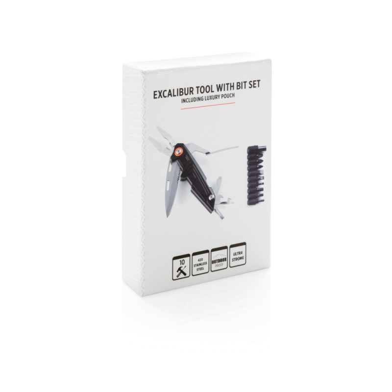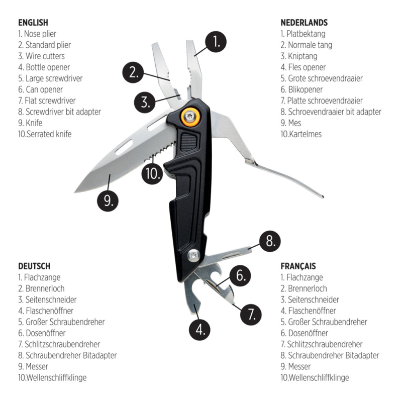 Extrémně pevný multifunkční nůž s 10 funkcemi: devíti členná sada bitů, adaptér na bity, kleště s jehlovou špičkou, utahovací kleště, štípací kleště, nůž s rovným ostřím, nůž se zubatým ostřím, plochý šroubovák, otvírák plechovek a lahví. Tělo z hliníku, nástroje z nerezové oceli. Baleno v luxusní krabičce s vysoce kvalitním 1680D pouzdrem.