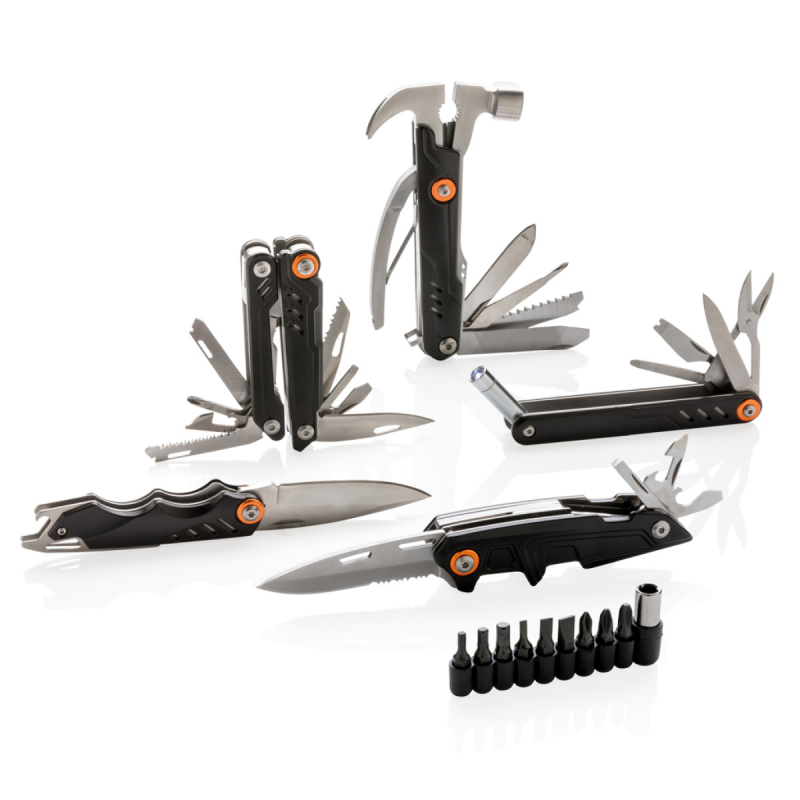 Extrémně pevný multifunkční nůž s 13 funkcemi: kleště s jehlovou špičkou, utahovací kleště, štípací kleště, nůž s rovným ostřím, nůž se zubatým ostřím, malý, střední a velký plochý šroubovák, křížový šroubovák, otvírák plechovek a lahví, pilník, pilka. Tělo z hliníku, nástroje z nerezové oceli. Baleno v luxusní krabičce s vysoce kvalitním 1680D pouzdrem.