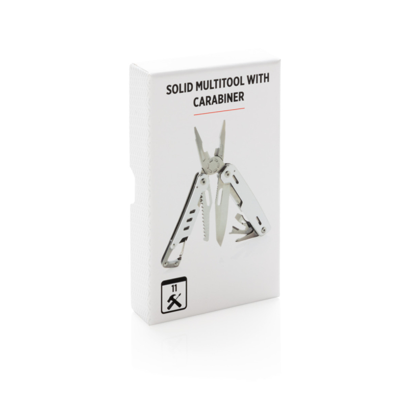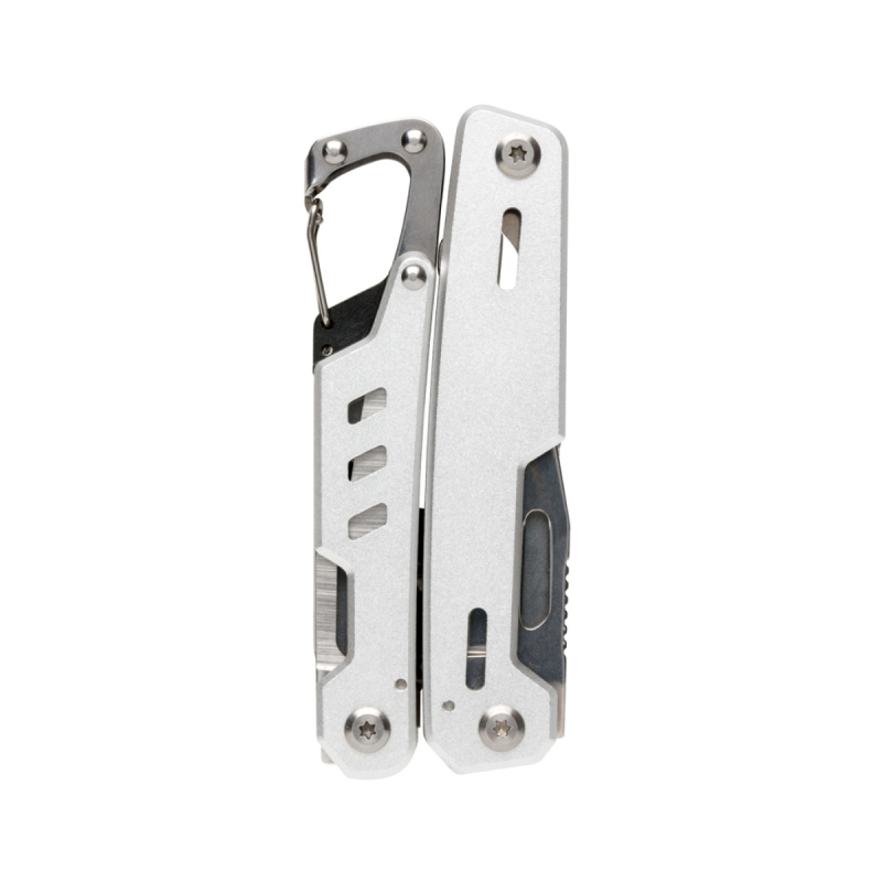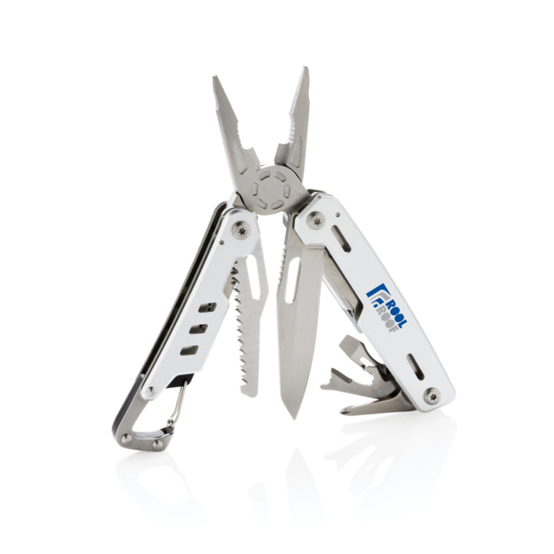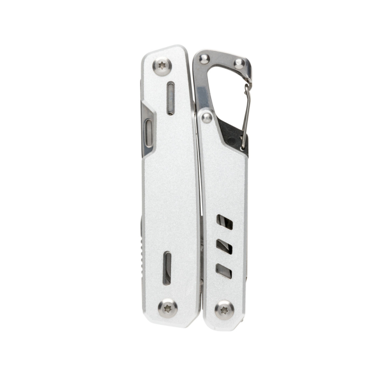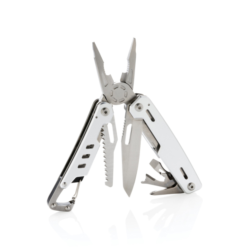 Kvalitní odolný multifunkční nůž s 11 funkcemi: kleště s jehlovou špičkou, utahovací kleště, štípací kleště, nůž, křížový šroubovák, plochý šroubovák, pilka, otvírák plechovek a lahví, odstraňovač izolace drátů, karabina. Tělo z hliníku, nástroje z nerezové oceli. Baleno v dárkové krabičce.